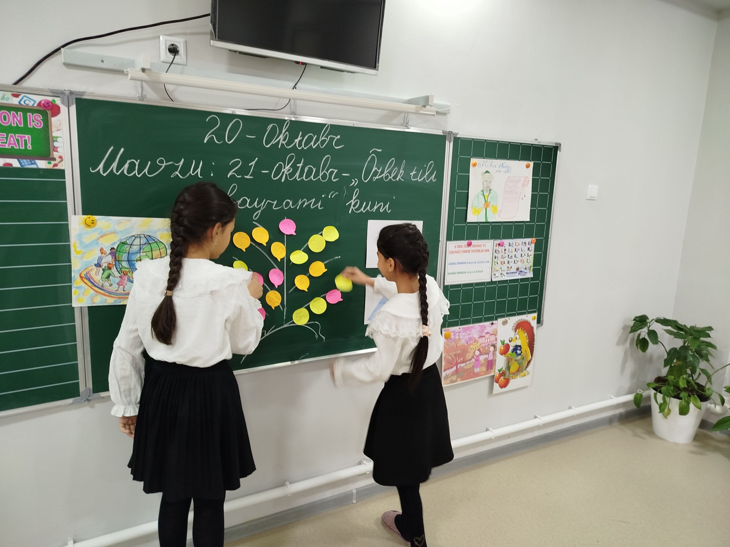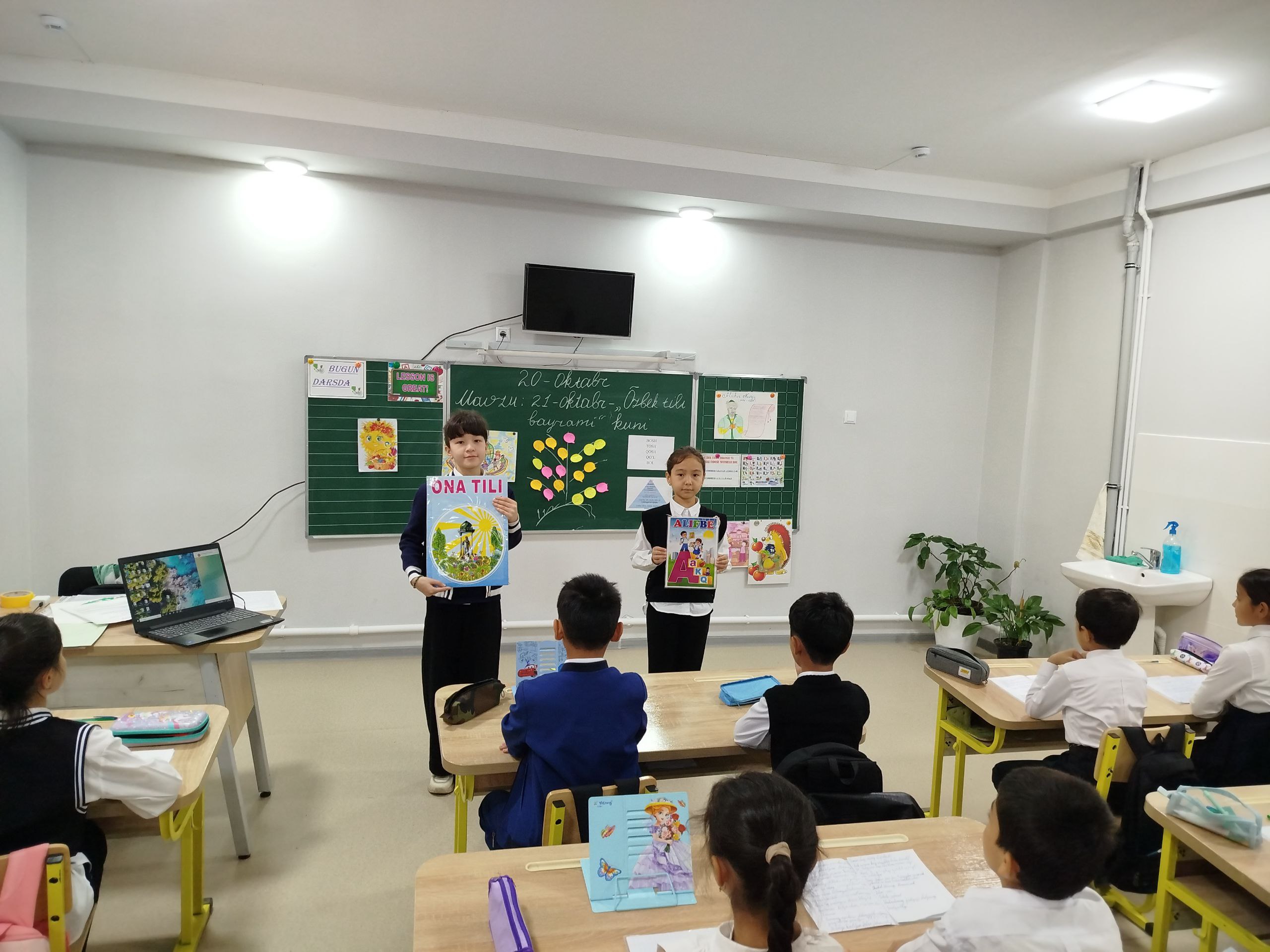 4 V - sinfida 20-oktabr kuni kelajak soatidan 21-oktabr O‘zbek tili bayrami kuni mavzusida tayyorlangan dars jarayonidan lavhalar